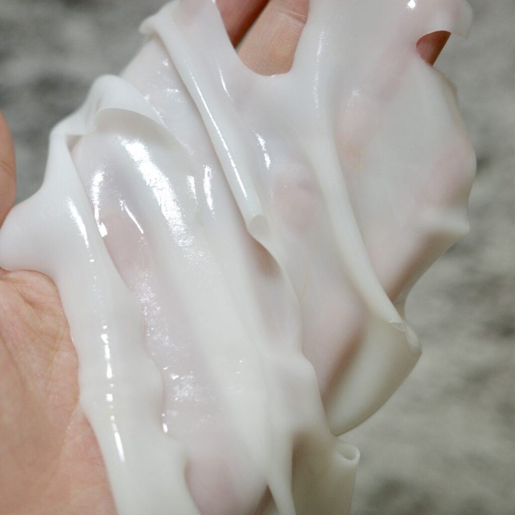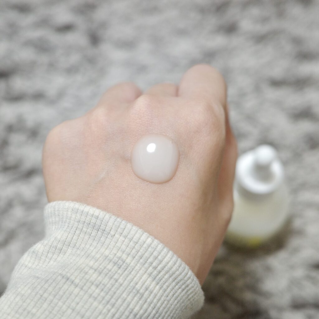 手に出してみると白っぽく、とろみのあるテクスチャーです。濃密な印象ですが、肌の上ではスッと伸び、使いやすいと感じました。